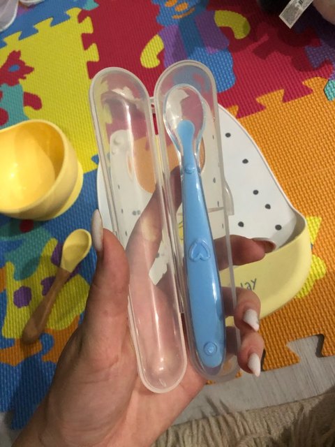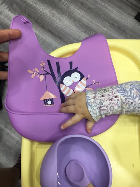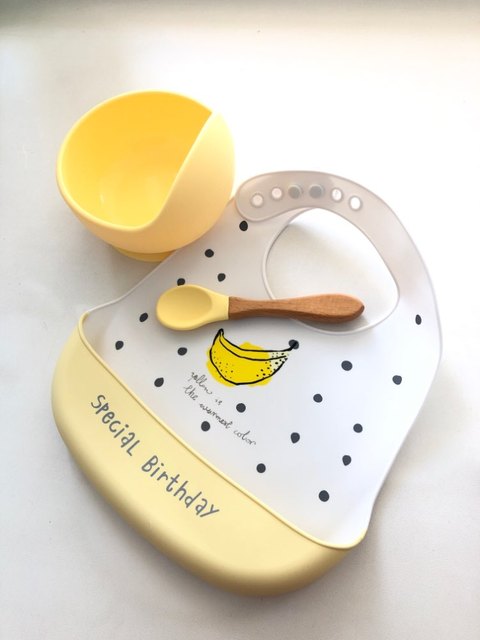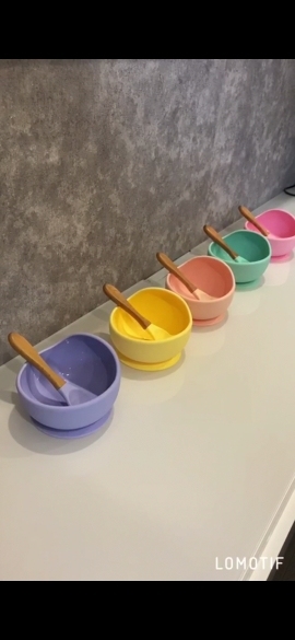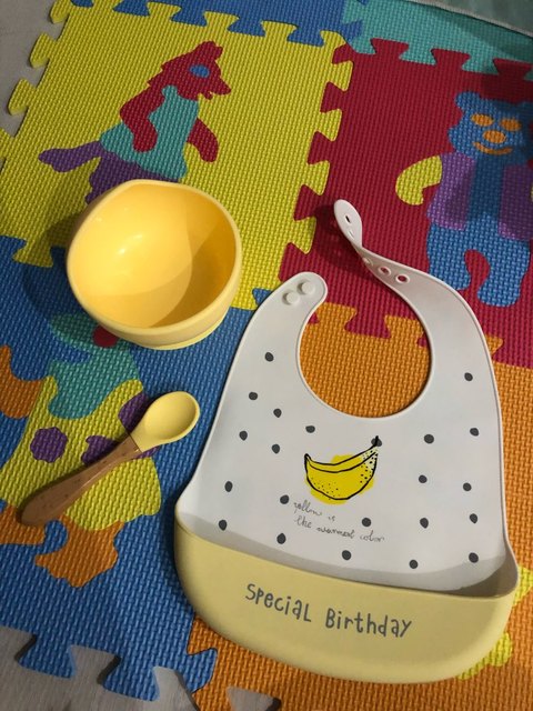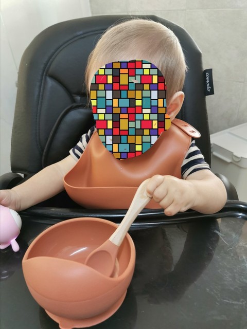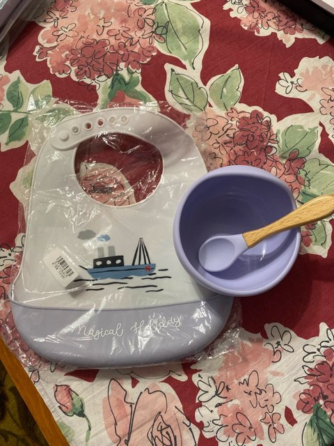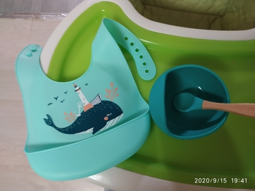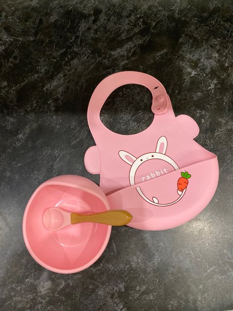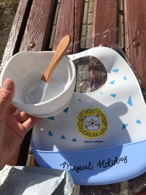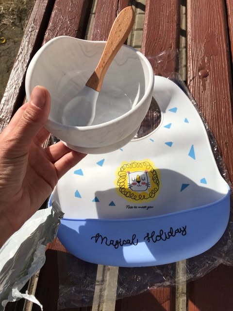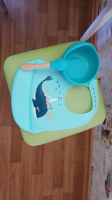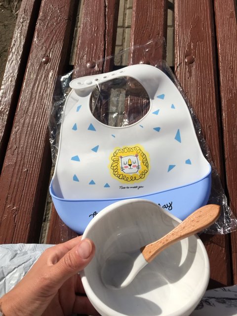 The store long sent the order, but the delivery is super fast! The quality is excellent! The bib is soft, pleasant to the touch, the fasteners are good. There is a small smell and the color is slightly lighter than the dishes. The photo is not so noticeable the difference. Not critical. Plate and spoon are excellent! The suction cup at the plate is strong, the plate itself is good, strong. The spoon is quality, the silicone is dense, the tree is well processed and covered. Seller Thank you!