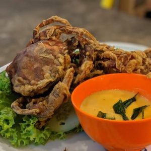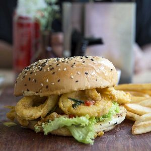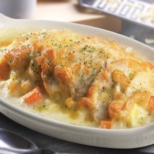 Grilled fish fillet in white sauce baked with savory rice and cheese.