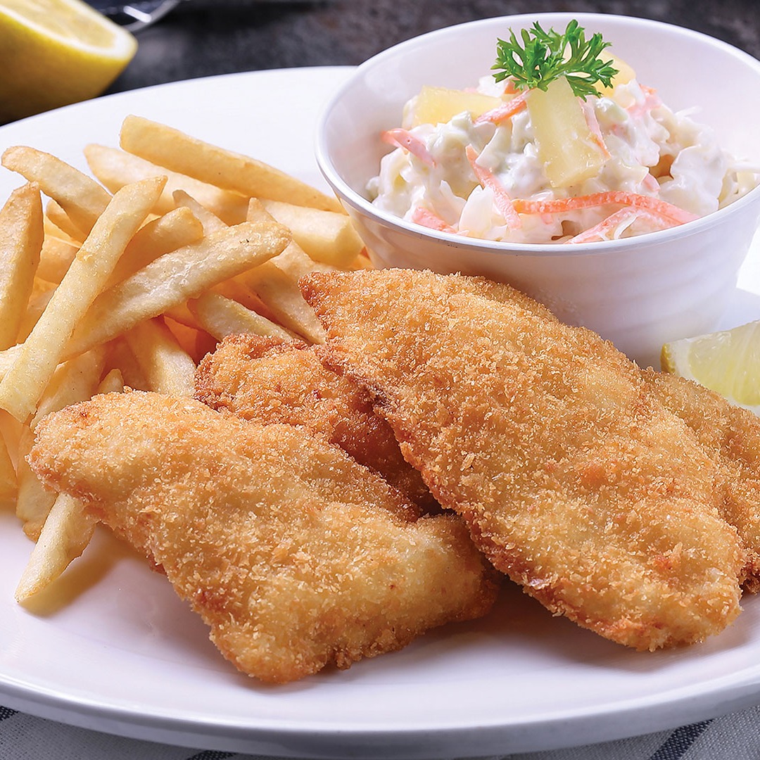All time Favourite. Tender ocean fresh fish fillet fried perfectly for that crisp exterior but moist and delicate flesh, served with our signature house tartar sauce, U.S. fries and tangy coleslaw.