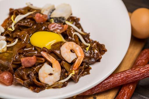 Wok-Fried Seafood Horfun, with Chinese Sausages and moon-like “raw egg”. A signature cze char dish