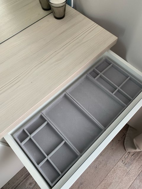 Доставили за 8 дней в СПб! Упаковано серьёзно и всё дошло целым. Качество хорошее, даже без запаха. Размер подбирал под ящик и все подошло. Очень хотел порадовать жену новым шкафом и такими лотками. Всё супер!